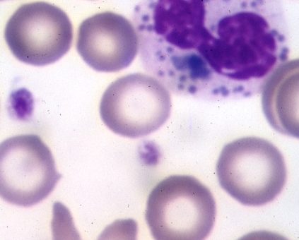 I (W. Wertelecki, M.D.) see a peripheral blood smear of a child with oculocutaneous partial albinism. The neutrophiles contain azurophilic and eosinophilic granules. In the image on the right and below is a cell shaped like a sickle (the patient has African ancestry). Please, see several additional illustrations of this blood smear.