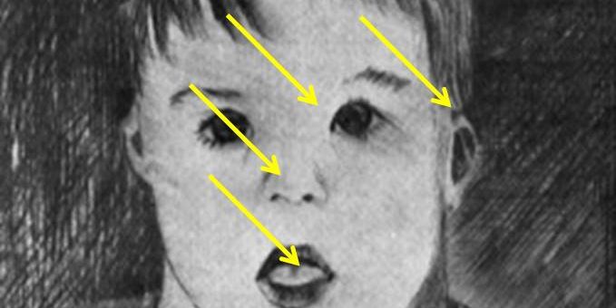 I see (W. Wertelecki, M.D.) a face with four concurrent signs (facial syndrome) or a facies in medical parlance. This facies my brain interprets as a signal of Down syndrome (DS). The arrows point to the signs that should be well-known to you (if not, please view the Dysmorphology Tutorial (a) or a related image.