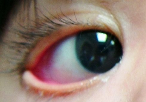 I (W. Wertelecki, M.D.) see a lower lid that sags outward or away from the eye exposing the inner eyelid – a sign that is called ectropion. I also see two depigmented spots on the iris (Brushfield spots). Of course, such patient would undergo general examination (which revealed multiple signs suggestive of Down syndrome).
