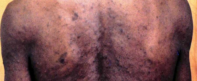 I (W. Wertelecki, M.D.) see an adult African-American male with multiple skin signs of NF1: café-au-lait (CaL) spots, neurofibromas and a diffuse melanic hyperpigmentation of most of the posterior chest (please view this image after enlargement by clicking on it).