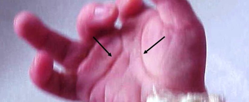 I (L. Yevtushok, M.D.) see a palm with a transverse distal flexion crease with an exit point between fingers 2-3. Some dysmorphologists call such crease, “jockey stick” – like, and consider such pattern as more frequent among children with Fetal Alcohol Spectrum Disorders (FASD). I also see a thenar flexion crease. There is no evidence of a proximal transverse flexion crease. There is considerable variability of the patterns by the mentioned creases. For more on this subject, see “Dermatoglyphics”.