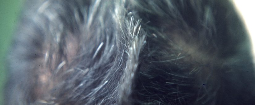 PERSPECTIVE: Dramatic example of disrupted hair patterning likely to be related to concurrent microcephaly. Also an illustration of deformation of a “comb-like” hair standing on ends mostly seen in non-human mammals – dermatoglyphic patterns provide equally dramatic illustrations in particular on fingertip with whirls patterns.
