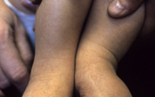 I (W. Wertelecki, M.D.) see irregular implantation of toes, in this instance, bilateral dorsal implantation of the second toe. In general, the toes are dysmorphic and perhaps there is podal dorsal puffiness (edema?).(See patient).