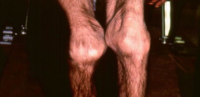 I (W. Wertelecki, M.D.) see large hypertrophic knee articulations (joints) and hirsutism of emaciated legs.