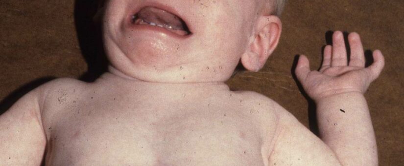 I (W. Wertelecki, M.D.) see a disgruntled dysmorphic infant. The most obvious signs are a flat upper lip (no filtrum and thin vermillion); short nose; a pectus excavatum and rigidity most evident in the fingers. CAVIAT – it is a bad idea to diagnose the flat filtrum or thin vermillion when a child is crying – my statement is based on other images when the child is relaxed.