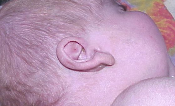 I (L. Yevtushok, M.D.) see a pinna (ear or auricle) with unusual morphogenesis sings: prominent lobule, a groove on the rim of the helix, a short antihelix absent in the upper half of the lobe (and other signs not illustrated here).