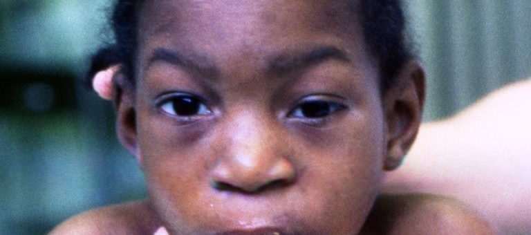 I (W. Wertelecki, M.D.) see a dysmorphic face (facies) and among other signs, I will call attention to a narrow forehead and small calvarium as well as a flat upper lip. These two concurrent signs suggest the imperative to consider as a cause prenatal exposure to alcohol. The manifestations of Fetal Alcohol Syndrome (FAS) are quite variable although a flat upper lip and microcephaly are among the most constant.