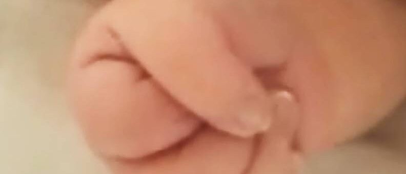 We (Drs. S. Kalynka and W. Wertelecki) see contracted fingers and a thumb overlapping the index finger. We suspect that the thumb-nail is narrow and hyperconvex – if so, the concurrence of the contractures, thumb-nail dysplasia and iniencephaly suggests the possibility of Patau syndrome (trisomy 13 or 13+).