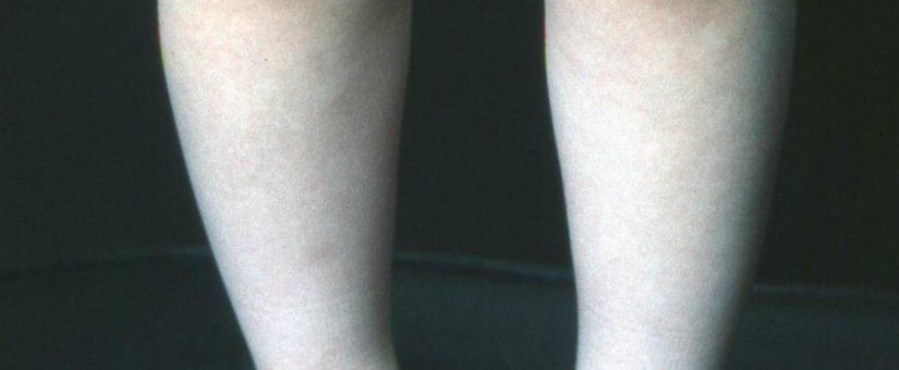 I (W. Wertelecki, M.D.) see a fifth and last illustration of this girl. Knees, ankles and feet do not reveal signs of clinical relevance to the context of those observed in the previous four illustrations. The slight bowing of the right ankle may be an artifact of photography. The toe nails are insufficiently visible. There is no podal edema and there is a gap between toes 1-2. In summary, this photograph is an example of the importance of documenting “negative” (absence) clinical signs. See further comments in the illustrative gallery of this patient.