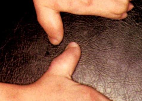 I (W. Wertelecki, M.D.) see a 2-5 bilateral finger syndactyly often referred to as “mitten hands”. This sign immediately signals the possibility of multiple syndromes manifested by other connective tissue anomalies. Please also note that the morphology of both thumbs is altered (short and broad).