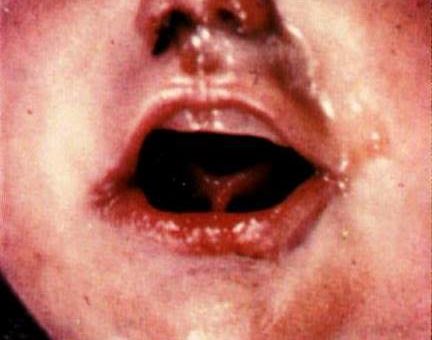 I (W. Wertelecki, M.D.) see an infant with inflammatory changes inclusive of the nose (rhinitis) and lips (cheilitis). It is provocative in this instance, the nasal discharge (rhinorrhea) and the angular cheilitis.
