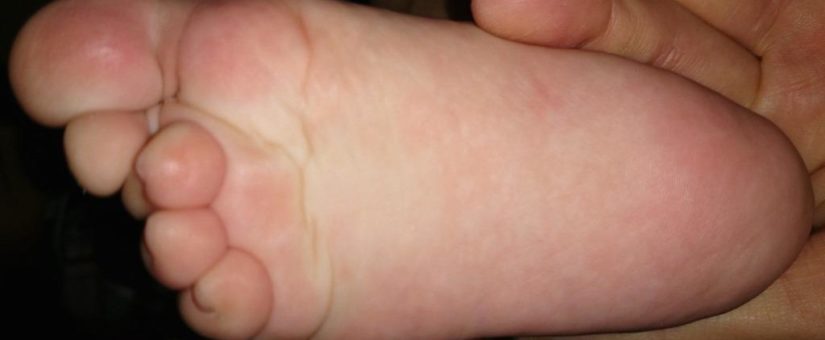 I (N. Kamut, M.D.) see the sole of a foot with a transverse flexion creases and dysmorphic toes – mainly a dorsal implantation of the second toe. The other images of the dorsum of the left and right foot likewise show dysmorphic toes – the left toes have short nails and toes 2-3-4 show a mild degree of syndactyly, the 5th toe is bent (clinodactyly) – on the right the 2nd toe is dorsally implanted.